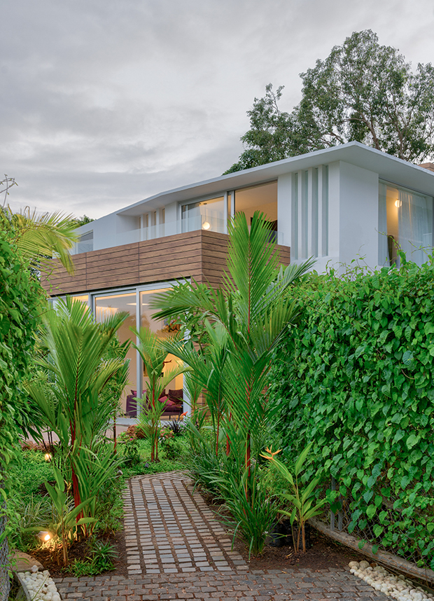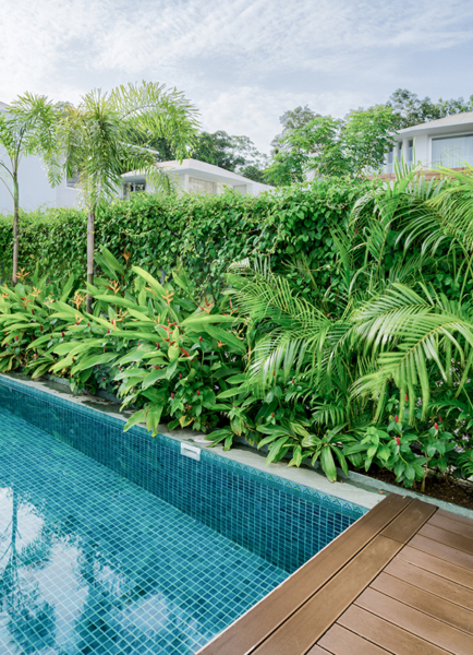 The meandering driveway, a maze of curved green walls dotted with towering flowering trees, will take you to your own haven of peace.